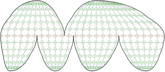 Up to latitudes 40°44′11.8″N/S, the map is projected according to the sinusoidal projection’s transformation. The higher latitudes are the top sections of a Mollweide projection, grafted to the sinusoidal midsection where the scale of the two projections matches. This grafting results in a kink in the meridians along the parallel of the graft. The projection’s equal-area property follows from the fact that its source projections are themselves both equal-area.