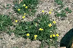 Goodenia geniculata, commonly known as bent goodenia or native primrose,[2] is a species of flowering plant in the family Goodeniaceae and is endemic to south-eastern Australia. It is a low-lying to ascending herb with linear to lance-shaped, often toothed leaves at the base of the plant and racemes of yellow flowers with hairy backs.