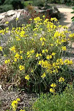 Goodenis glomerata is an erect herb that typically grows to a height of 50 cm (20 in) and has cottony yellowish to grey hairs. The leaves are mostly at the base of the plant, elliptic to lance-shaped with the narrower end towards the base, 6–200 mm (0.24–7.87 in) long and 10–22 mm (0.39–0.87 in) wide, with toothed edges. The flowers are arranged in compact spikes 120–300 mm (4.7–11.8 in) long with lance-shaped bracts 12–20 mm (0.47–0.79 in) long and bracteoles 8–15 mm (0.31–0.59 in) long. The sepals are linear to lance-shaped, 8–10 mm (0.31–0.39 in) long, the corolla yellow, 20–30 mm (0.79–1.18 in) long with cottony hairs and star-shaped hairs on the outside. The lower lobes of the corolla are 9–11 mm (0.35–0.43 in) long with wings about 2 mm (0.079 in) wide. The fruit is a cylindrical capsule 8–9 mm (0.31–0.35 in) long.[2][3]