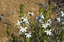 Goodenia scapigera is an erect, perennial herb or shrub that typically grows to a height of 0.3–1.5 m (1 ft 0 in – 4 ft 11 in) and is glabrous. The leaves are linear to narrow egg-shaped with the narrower end towards the base, more or less clustered at the ends of the stems, 40–60 mm (1.6–2.4 in) long and 2–10 mm (0.079–0.394 in) wide, sometimes with toothed edges. The flowers are arranged in thyrses up to 200 mm (7.9 in) long, with linear bracts about 5 mm (0.20 in) long and linear bracteoles about 2 mm (0.079 in) long. Each flower is on a pedicel 1–3 mm (0.039–0.118 in) long with linear to triangular sepals 7–8 mm (0.28–0.31 in) long. The petals are white with purplish spots near the base, 8–18 mm (0.31–0.71 in) long, the lower lobes of the corolla 7–11 mm (0.28–0.43 in) long with wings about 1 mm (0.039 in) wide. Flowering mainly occurs from September to January and the fruit is an oval to elliptical capsule 5–7 mm (0.20–0.28 in) long.[2][3]