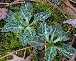 Goodyera, commonly called rattlesnake plantain,[2] jade orchids[3] or ladies' tresses[4] is a wide-ranging genus of orchids in the tribe Cranichideae. About 100 species of Goodyera have been formally described. With a center of diversity in East Asia, Goodyera is found across Europe, Madeira, North and Central America, Australia, and on islands from the west Indian Ocean to the Pacific Ocean. They have a rosette of leaves at their base and usually many small white resupinate flowers. They are similar to orchids in the genus Spiranthes but can be distinguished from them by the shape and colour patterns of the leaves.