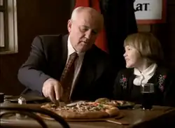 A conversation begins among a family at a different table. They speak the Russian language, but English subtitles are provided.[2] The father, played by Richard Marner,[7] notices Gorbachev and complains, "Because of him we have economic confusion." The son argues, "Because of him, we have opportunity." The conversation continues: "Because of him, we have political instability."—"Because of him, we have freedom."—"Complete chaos."—"Hope!". The mother cuts in, saying, "Because of him we have many things, like Pizza Hut." Suddenly, everyone in the restaurant agrees. They stand up and chant, saying "Hail to Gorbachev!", and Gorbachev is shown smiling.[5][8]