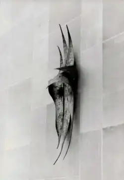 In 1967, Smith was elected to the Royal Canadian Academy of Arts.[6] That same year, he was commissioned to create Canada Screen for the Canadian pavilion at Expo 67.[3][7] The screen was made of cor-ten steel, measured 110' x 12' and weighed approximately 13 tons.[3] The Musée d'art contemporain de Montréal has the study done for Canada Screen in their permanent collection. It is currently installed in front of the Hôpital Maisonneuve-Rosemont in Montreal.[8] Bursting with diverse elements, it is representative of the artist's desire to set movement within works that convey the transience and the intensity of life.[9] The combination of rays and vertical beams from the study were incorporated into the Expo 67 Canada Screen.[9]