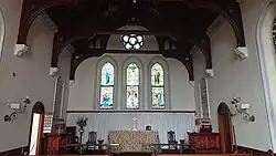 The chapel boasts the largest collection of Pre-Raphaelite stained glass windows in Scotland,[9] produced by Morris and Co, some designed by Sir Edward Burne-Jones.[3] These include depictions of the Crucifixion (1874), Saint Cecilia (1879), Saint Ursula (1887), the archangel Raphael (1902), Christ as the Good Shepherd (1903) and the archangel Michael (1914). The St Michael window is dedicated to Bernard Charles Gordon-Lennox, third son of the seventh Duke of Richmond, who was killed in fighting near Ypres in November 2014, aged 36, during the First World War.[10]