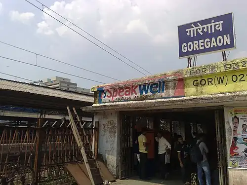 Goregaon (Marathi pronunciation: [ɡoːɾeɡaːʋ], formerly Goregaumn, station code: GMN) is a railway station on the Western line and Harbour line of the Mumbai Suburban Railway network. It serves the Mumbai suburb of Goregaon.