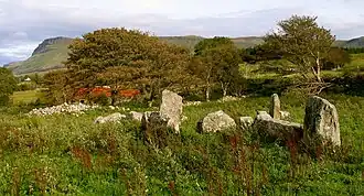 The monument consists of a central court which is 6 m (20 ft) in diameter. An entrance passage to the south leads into the court. A pair of galleries open to the east and west. The west gallery is 7 m (23 ft) long and the east is 5 m (16 ft) by 2.5 m (8 ft 2 in) long.[4] The majority of the cairn stones are missing, haven been used to construct the massive drystone field walls around the monument.