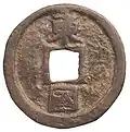 The "Geonwon Jungbo", an iron coin inscribed with Geonwon Jungbo (건원중보; 乾元重寶) on one side and Dongguk (동국; 東國) on the other side, was excavated from a Goryeo tomb in the vicinity of Kaesong, the capital of Goryeo, in the early 1910s; it was unearthed along with bronze Geonwon Jungbo, Dongguk Tongbo, and Dongguk Jungbo coins.[18][19] However, its relation to Goryeo's iron coins minted in 996 is controversial.[20] Gary Ashkenazy of "Primal Trek" says that the Geonwon Jungbo is not mentioned in Korean historical sources and was not cataloged until 1938 in the Tōa senshi (東亞錢志) by Masahiro Okudaira, in which it is attributed to Goryeo.[21]