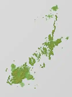 There are 140 islands, including five main ones: Fukue Island (福江島, Fukue-jima), Hisaka Island (久賀島, Hisaka-jima), Naru Island (奈留島, Naru-shima), Wakamatsu Island (若松島, Wakamatsu-jima), and Nakadōri Island (中通島, Nakadōri-jima).[4] The northernmost island is Ukujima.