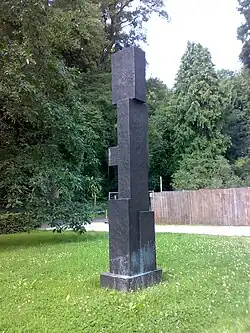 Also nearby was the 'Landgrafensäule' or 'Landgraf column', erected in 1816 on what later became the visual axis from the Gothic House to the Elisabethenschneise, which in turn leads to the Hirschgarten. The original column was moved to the castle in 1835, but a replica was built near its site in 2011.[1] The replica and original both bear an inscription, which translates as: