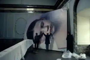In 1988, in remembrance of the Night of the Broken Glass (Kristallnacht), which had happened 50 years earlier, Helnwein erected a large installation in the city center of Cologne, between Museum Ludwig and the Cologne Cathedral: Selektion – Neunter November Nacht ("Selektion – Ninth November Night). The gallery featured a four-meter-high, hundred-meter-long picture lane in which the artist recalls the events of Reichskristallnacht, often taken to be the beginning of the Holocaust, on November 9 1938. He confronts the passersby with larger-than-life children's faces lined up in a seemingly endless row, as if for concentration camp selection. Just days into the exhibit, these portraits were vandalized by unknown persons, symbolically cutting the throats of the depicted children's faces. Helnwein consciously left the panels with the gashes and included them in the presentation, as he believed that they made the work stronger and more relevant.[49][50][51]