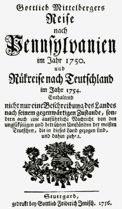 Gottlieb Mittelberger (1714 – 1758) was a German author, schoolmaster, organist, and Lutheran pastor.[1][2] He was best known for his work Journey to Pennsylvania (1756). Mittelberger's travelogue provides a firsthand historic account of the misery and exploitation of German immigrants during the US colonial period. In his work, he tries to convince his fellow Germans not to immigrate to the American colonies, as the forfeiture of freedom, cost of money, lack of health, and loss of life are too exorbitant to risk and sacrifice. Although never an indentured servant, Mittelberger's written testament is one of several surviving historic works describing the hardships of the redemption system.