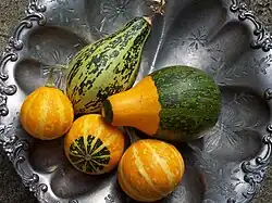 Gourd is occasionally used to describe crop plants in the family Cucurbitaceae, like pumpkins, cucumbers, squash, luffa, and melons.[1] More specifically, gourd refers to the fruits of plants in the two Cucurbitaceae genera Lagenaria and Cucurbita,[2][3] or also to their hollow, dried-out shell.