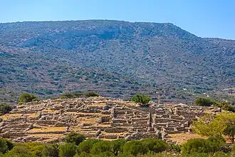 Gournia (Greek: Γουρνιά) is the site of a Minoan palace complex in the Lasithi regional unit on the island of Crete, Greece. Its modern name originated from the many stone troughs that are at the site and its original name for the site is unknown.[1] It was first permanently inhabited during the Early Minoan II periods (approximately between 2650-2100 B.C.E) and was occupied until the Late Minoan I period (approximately between 1700-1470 B.C.E.).[2] Gournia is in a 6 mile cluster of with other Minoan archeological sites which includes Pachyammos, Vasiliki, Monasteraki, Vraika and Kavusi. The site of Pseira is close but slightly outside the cluster.[3]