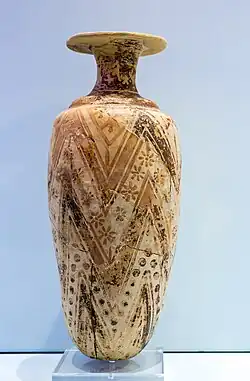 The Sphoungaras cemetery's natural rock shelters, openings in the rock, provided the Minoans for a suitable space to bury their dead without the need for physical labor to create or build tombs.[2] The cemetery was in continuous use for the continuous settlement of the site by the Minoans.[2] Inhumation was the preferred mode of body disposal from early Bronze Age until the pithos burial, where the bodies were placed inside a large storage container.[7] This method was introduced and became the norm around 1900-1800 BC. These burials were first excavated by Harriet Boyd and later revisited by Richard Seager in 1910 and by Soles and Davaras in 1970.[1][7] Some of the artifacts found were various types of complete vases, jewelry, and seals made out of ivory.[7]