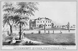 On March 16, 1790, the New York state legislature authorized the demolition of Fort George and the building of a government house for the "temporary use and accommodation of the President of the United States of America, during such time as the Congress of the United States shall hold their sessions in the city of New York."[3] On March 24, proposals for the building were requested. The architect, John McComb, Jr., submitted plans, but apparently they were not used, since they do not match the house as built. James Robinson became the architect and designed a Georgian-style mansion.[4][5] During the coming months, the fort defensive walls and enclosed buildings were taken down. Some stones were even reused to build the new government house.[6] The cornerstone of this new building was laid on May 21, 1790.[7] However, before the building was completed, Congress passed the Residence Act of July 16, 1790, which named Philadelphia as the temporary national capital for a 10-year period while the permanent national capital was under construction at what is now Washington, D.C. Thus, President Washington never resided in this public building, intended to be his executive mansion.[7][8]