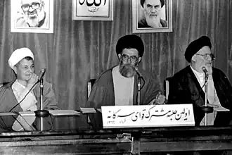 Joint Tripartite Meeting of Iranian Government, 2 June 1987. Speaker of the Parliament Hashemi Rafsanjani (left), President Ali Khamenei (middle) and Head of Supreme Court Mousavi Ardebili (right).