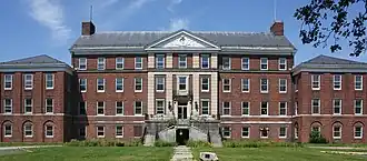 In 1927, General Hanson Edward Ely commenced a major program to build several mostly Georgian revival structures on Governors Island.[93] The new structures included a movie theater, a YMCA, an "officer's club", and a public school.[93][22] The three-story Liggett Hall (also known as Building 400), a military barracks spanning nearly the entire width of the original island, was built on the site of former World War I warehouses, and was one of the world's largest barracks upon its completion in 1928.[113][93][73] Afterward, the Army hired McKim, Mead & White to build a "barracks district" near Liggett Hall.[115] During the 1930s, the Works Progress Administration landscaped much of the island and reinforced many existing structures, hiring up to 5,000 workers in the process.[116][117][118] Some of the WPA's projects included the restoration of the General's House,[119] as well as the eradication of invasive Japanese beetles.[118][120] The Army also incrementally repaved Governors Island's roads so they could accommodate modern vehicles, and constructed garages.[121]