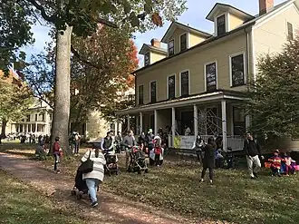 The Army still retained a military presence on the island, and in the 1830s, it constructed several new buildings, such as officers' barracks and a hospital.[68][69] The Army also added masonry seawalls[71] and opened an "administrative and training center" starting from the 1850s.[22][63][71] The erection of the recruiting center and barracks resulted in the creation of Nolan Park, to the east for Fort Columbus.[71] Together with these changes, a grassy area was cleared between Fort Columbus and Castle Williams to allow better vantage points should defensive attacks be launched.[72][73] Other Army structures included a muster station that operated throughout the Mexican–American War and American Civil War,[22][74] as well as a music school.[22] Still, most of the troops continued to live in tents.[71] To accommodate Army personnel's religious requirements, a small Gothic Revival chapel for Protestants was built on Governors Island in 1846.[75][76][77]