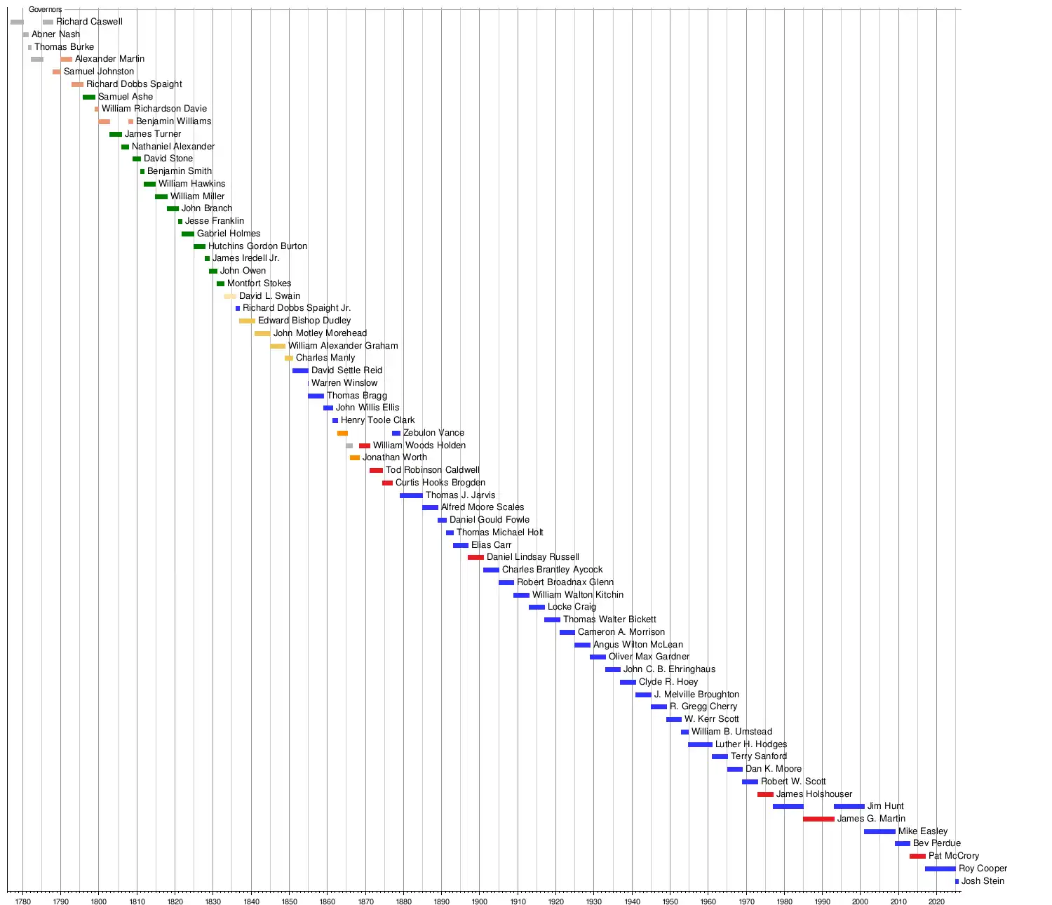 In 1977, the North Carolina constitution was amended, allowing governors to pursue re-election to a consecutive four-year term in office. This amendment strengthened the political authority of the office.[34] Another amendment gave the governor discretion to curtail state spending in the event it was necessary to maintain balance with collected revenues.[35] Following a 1995 referendum resulting in a constitutional amendment effective the subsequent year, the governor was granted veto power, becoming the last governor in the country to be given this power. Mike Easley became the first North Carolina governor to veto legislation after rejecting a bill in 2002.[12] While institutional enhancements increased the formal power of the governorship over the course of the 20th century, this was counteracted by a corresponding rise in the legislature's growing willingness to assert its separate desires in state policy.[36] In 2018, the General Assembly significantly curtailed the number of appointments which could be made by the governor, dropping appointive roles from about 1,500 to 300.[37] The incumbent governor is Josh Stein, a Democrat who assumed office on January 1, 2025.[38]