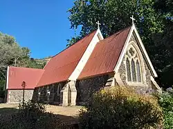 St Cuthbert's Church in Governors Bay Road, built in 1860, is also a Category I building.[17] It was extensively damaged in the September 2010 quake.[18] The local community worked with the Church Property Trust to repair and restore the church and it was reopened in 2017.[19] The church grounds contain the grave of Mary Elizabeth Small whose story is told in the children’s novel The Runaway Settlers.[20][21]