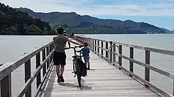 Governors Bay Jetty is a 300 m (980 ft)-long wooden jetty that juts out into the bay. It is open to the public and free to use. The jetty is generally used for walking, fishing, and jetty jumping. It provides a great view of the surrounding volcanic landscape and access to the water at tide times when it is not possible to access from the shore due to the mudflats. The original short jetty (approx. 20m long) was built in 1874 and extended to 300m in 1913. After the 2011 Christchurch earthquakes, the jetty was closed to the public and the Council did not plan to repair it. However, a group of local volunteers set up Governors Bay Jetty Restoration Trust and raised money to rebuild the jetty. The rebuild project started in October 2022 and finished in September 2023 and was managed by the trust.[12]