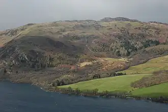To the south the fell is bounded by Ullswater. The southern slopes of the fell are wooded, providing a picturesque backdrop for views over Ullswater. Above this is a fringe of rock, the main feature being Yew Crag at the south-eastern corner of the fell. The woodlands and crags continue eastwards beneath Great and Little Meldrums. The rocky spur of Gate Crags and Birk Crag juts out from Little Meldrum toward the lake. To the east the fell is bounded by lower land which drains directly into Ullswater.[2]
