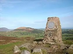 The summit is the rocky Airy Crag, on which an Ordnance Survey triangulation pillar has been built. This now bears a National Trust plaque, reflecting the ownership of the land. Views from here include the two Mell Fells, Blencathra and the Northern Fells, and the northern parts of the Helvellyn range including the Dodds.[3] This summit is set back to the north of the fell, about 1.6 km from the shore of Ullswater, limiting views of the lake though the fells beyond it and up the Patterdale valley can be seen.