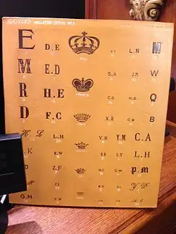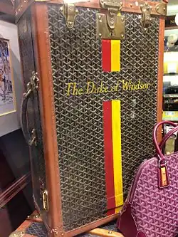 Goyard's letterhead paper dated 24 June 1891 bore the coats of arms of the United Kingdom and the Russian Empire and the Great Seal of the United States of America. The queens of Yugoslavia and Greece became customers after World War II, whilst the Duke and Duchess of Windsor purchased their first Goyard goods in 1939. High-profile purchasers such as the Grimaldis or the Maharajah of Kapurthala rub shoulders with celebrities, socialites or first ladies like Catherine Deneuve, Édith Piaf, Romy Schneider, Jean-Claude Brialy, who acquired his first Goyard pieces in 1974, Mrs Georges Pompidou, who became a client from 1963 onwards, princess Andrée Aga Khan (1956), princess Radziwill (1949) or the prince and princess von Fürstenberg (1968).[28] Contemporary glitterati like Madonna, Victoria Beckham, Carla Bruni-Sarkozy are regularly spotted wearing Goyard bags. Kanye West mentioned his affinity for Goyard trunks in the 2007 song, The Glory,[29] and Rich the Kid filmed a music video in a Goyard store.