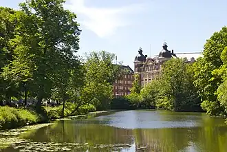 The building at the other end of the street (Grønningen 21–25) is the former headquarters of Nordisk Livsforsikring Selskab (English: Nordic Life Inssurance Company). It was built in 1910 by Axel Preisler and was renovated in 2006. It now serves as head office for M. Goldschmidt Holding.[4] The large neighbouring property at No. 17-19 is the former headquarters of Nordisk Livsforsikrings-Aktieselskab af 1897 and was built from 1913–1914 to designs by Vilhelm Fischer (completed by N.P.P. Gundstrup).[5] The IT consultancy Netcompany is now based at No. 17.