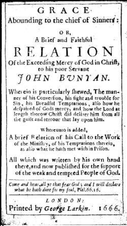 Grace Abounding to the Chief of Sinners, or a Brief Relation of the Exceeding Mercy of God in Christ to his Poor Servant John Bunyan is a Puritan spiritual autobiography written by John Bunyan. It was composed while Bunyan was serving a twelve-year prison sentence in Bedford gaol for preaching without a licence, and was first published in 1666.