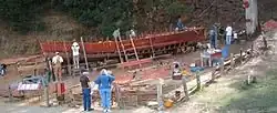 Muir negotiated an agreement between the two parks to build the junk using volunteer labor and redwood lumber for most of the hull, milled from logs donated by a conservation group. Construction began in March, 2003.[5] Traditional Chinese shipbuilding techniques were used, such as flame bending of planks, and edge-nailing using hand forged nails.[5] Joints between the planks were sealed using traditional caulk made by volunteers out of a mixture of lime and linseed oil.[1] This substance is called chu'nam, and also includes organic fibers, such as animal hair, grasses or bamboo fiber.[4]