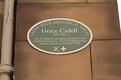 In 1899, when Elsie Inglis created the Medical Women's Club, set up with the prime aim of starting a hospital for women, Grace Cadell was a prominent member of the club and subsequently served on the medical committee of the hospital, which was opened at 11 George Square.[9][10] In 1904 she joined the staff of The Hospice, on the Royal Mile, a hospital for women and children which had been set up by Elsie Inglis. She specialised in obstetrics and gynaecology and in 1911 she took over directorship of the whole clinic.[9] She later became registrar at the New Hospital for Women in London.[1]