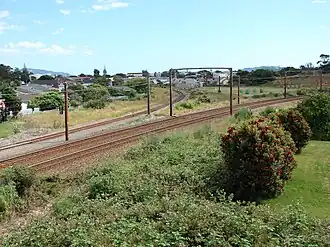 Electrification of the Woburn – Hutt Park section commenced in 1953 using the 1.5 kV DC overhead line system, coinciding with the electrification of the Wairarapa Line between Wellington and Taita. The catenary was extended slightly in 1959-60 to allow for EMUs running race trains to Hutt Park to use a workshops siding. A further extension of the catenary was opened in 1964 for goods trains to Gracefield Freight Terminal.[6] Though there were no electric trains running on the branch from 1983 following the cessation of the workers' trains to the workshops, and the catenary and related electrification infrastructure were removed in 1990.[7][8]