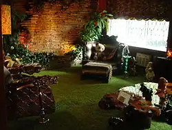 When Elvis toured, staying in hotels, "the rooms would be remodeled in advance of his arrival, so as to make the same configurations of space as he had at home – the Graceland mansion. His furniture would arrive, and he could unwind after his performances in surroundings which were completely familiar and comforting." 'The Jungle Room' was described as being "an example of particularly lurid kitsch."[20]