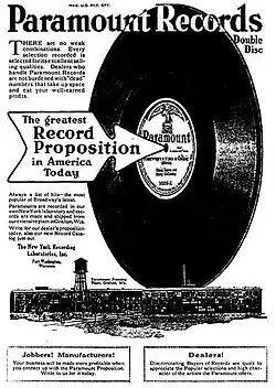 In the early 20th century, the Wisconsin Chair Company of Port Washington operated a chair factory in the village. At the time, the company was the largest business in Ozaukee County, employing one-sixth of all workers.[33] Among other the wooden furniture, the company manufactured phonographs for Edison Records. In 1917, the company decided to start its own subsidiary record label: Paramount Records. In the 1920s, Paramount produced records for African-American consumers, and from 1929 to 1935, Paramount recorded and manufactured records in-house at the Grafton chair factory before closing during the Great Depression.[8]