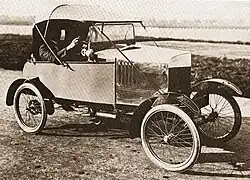 From 1920 onwards a very basic two-seat 3.3 hp type with air-cooled single-cylinder engine of 348 cc capacity was offered. It had a two-speed transmission with final chain drive. The car had quarter elliptical spring suspension front and rear as well as flex in the wood frame and seat cushions.[1] In 1921 a 7 hp type with a Coventry Victor twin-cylinder engine (capacity: 689 cc) and friction drive was added for one year only followed in 1924 by a four-cylinder 10 hp type with a Dorman engine of 1,094 cc, but very few were made.[1] The final Angus-Sanderson cars were also made in the factory.[1]