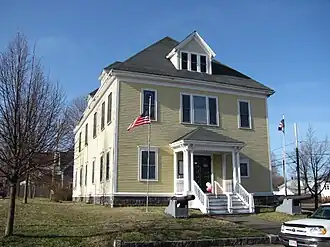 The Grand Army of the Republic Hall is an historic building located at 34 School Street in Rockland, Massachusetts, in the United States. The hall was designed by local builder William Harrison Hebberd, and built in 1899 by members of the GAR as a memorial to the Union Army veterans of the Civil War. It is a somewhat plainly decorated two-story wood-frame building with a hip roof. Its most elaborate exterior feature is the main entry, a porch supported by clusters of narrow columns, and with brackets in its eaves. The interior is more elaborately decorated, and has retained most of its original Queen Anne details.[2]