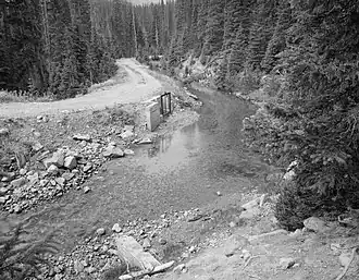 The Grand Ditch was built by the Larimer County Ditch Company, mostly by Japanese crews, working with hand tools and black powder. The first diverted water flowed east across La Poudre Pass on October 15, 1890. Water Supply and Storage Company took over ownership in 1891.[5] The ditch was extended every year, and reached three miles in 1894.[6]