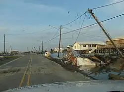 Hurricane Ida's eastern eye wall hit the area on August 29, 2021, on the 16th anniversary of Hurricane Katrina, causing widespread damage. It was reported that 100 percent of Grand Isle's structures were damaged, and around 40–50 percent of structures were completely destroyed.[7][8] Nearly all of the town's utility poles had either bent or collapsed from the extreme winds. Entergy decided to fully rebuild and strengthen the island's power grid instead of repairing it like most communities north of Grand Isle had received.[9]