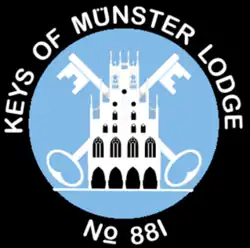The Lodge seal/jewel depicts the Town of Münster with the crossed Keys incorporated into it. It is a combination of the crossed keys logo of the 2nd Infantry Division, who were part of the British Army of the Rhein (BAOR), stationed in Münster and the local Münster Town Hall (Rathaus) logo, combining the City of Münster and the British Military with Freemasonry universal.