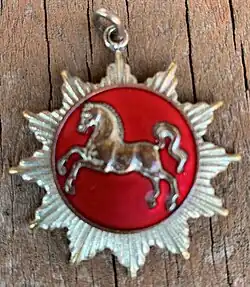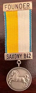 The Lodge Seal/ Jewel ("Jewel" is the term used within masonry to describe an ornament worn on the chest or around the neck on a collar, typically displaying the Lodge crest or seal) is dominated by the rearing stallion that is represented widely within Niedersachsen (Lower Saxony) and stands proudly on the Niedersachsen flag. The Founders Jewel has the added ribbon of yellow and white which represents the colors of Celle, where are lodge was founded in 1957. Copies of which are held in the Celle town archives along with the consecration summons.