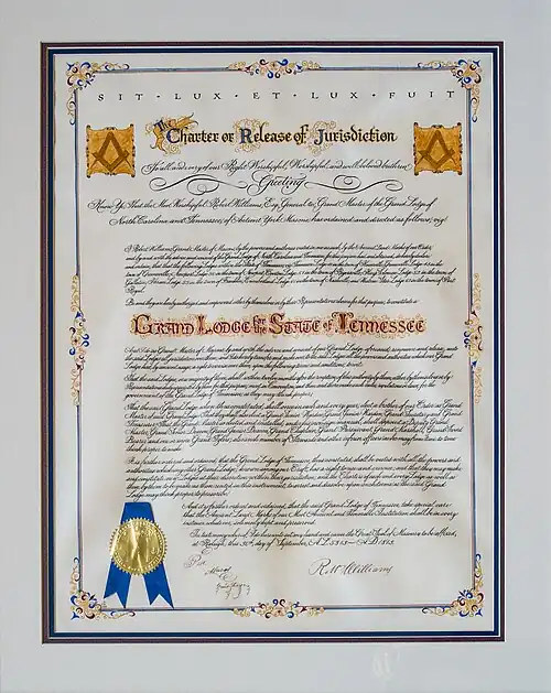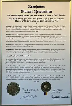 The Grand Lodge of North Carolina, formally the Grand Lodge of Ancient, Free and Accepted Masons of North Carolina, was formed on December 12, 1787.[1] Previously, it was the Provincial Grand Lodge of North Carolina, being under jurisdiction of the Premier Grand Lodge of England since January 14, 1771. It is currently composed of 349 active lodges across the 100 counties of North Carolina.[2] The Grand Lodge recognizes its Prince Hall counterpart, The Most Worshipful Prince Hall Grand Lodge of North Carolina and its Jurisdictions, Inc., and maintains co-territorial jurisdiction and encourages visitation between the two entities.