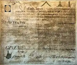 On January 14, 1771, the Premier Grand Lodge deputized Montfort by warrant to be the "Grand Master of and for America." The warrant is in possession of the Grand Lodge of North Carolina and is written in ink and copper on parchment. The seal of the Premier Grand Lodge of England is in the upper left corner.[14][15][16] Although his commission granted him jurisdiction over the English colonies, notes from the Premier Grand Lodge of England at the time noted his commission's jurisdiction was over the Province of North Carolina. Nonetheless, Montfort styled his signature "G.M.A.," meaning "Grand Master, America," and indeed chartered a lodge outside the Province of North Carolina.[17][18][19]