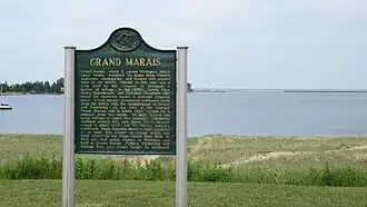 The name Grand Marais (French: great marsh) is a reference to the large, shallow harbor. French explorers and fur traders from the time of New France used the word "marais" to mean "harbor of refuge" as well as "marsh."