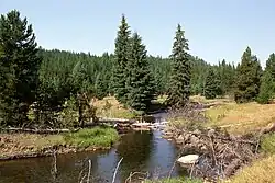 Early gold mining along the river's headwaters was followed by dredge mining in the 1930s and 1940s that deposited tailings along more than 2 miles (3.2 km) of the riverbed. The tailings buried the natural floodplain and forced the river into a constricted channel on the west side of the valley.[99] Starting about 2010, the Forest Service has conducted restoration work along this reach.[100]