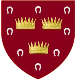 Gules three Antique Crowns Or within an Orle of eight Horseshoes Argent [10]
