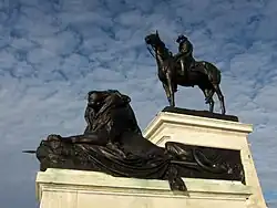 Surrounding the main pedestal are four shorter pedestals, each supporting a bronze lion in repose guarding both the United States flag and the flags of the Army. The memorial was the largest bronze sculpture cast in the United States at that time.[4]
