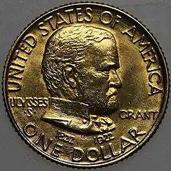 The designs for the two coins are identical except for the denomination. Laura Fraser worked from a photograph of Grant, by the studio of Mathew Brady, for the obverse; Taxay described Fraser's version as "remarkable for its strength and character".[17] On the coin, Grant wears a military coat, as he did during the Civil War, but the closely cropped beard suggests he is meant to look as he did in the years after the conflict.[18] Beneath the bust of Grant, facing right, is Fraser's initial G, for her birth last name, Gardin. Arlie L. Slabaugh, in his volume on commemorative coins, noted that Fraser had signed the Alabama coin LGF, and suggested that the single initial was to make less obvious the designer, lest there be charges of nepotism due to her husband's status as a CFA member.[19] Elsewhere on the obverse may be found Grant's name, the centennial dates, the denomination of the coin, and the issuing nation.[19]