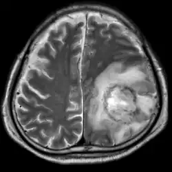 | T2-weighted MRI showing a necrotic brain abscess caused by Acanthamoeba. | |