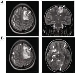 B: T1-weighted MRI showing expansion of the brain infection 4 days later